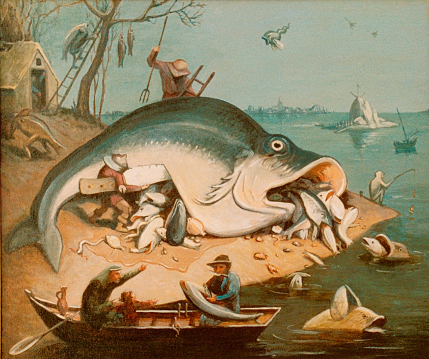 Flamanski slikar Pieter Brueghel stariji: "Velika riba jede malu ribu" (1556.) - slika pruža zlokoban prikaz nasukane ribe tako goleme da se jedan ribar mora služiti ljestvama kako bi joj se popeo na leđa, dok se drugi koristi nožem koji je duži nego on sam kako bi rasporio njezinu trbušnu šupljinu. Iz te velike rane kao i iz usta mrtve ribe ispada čitav niz drugih manjih riba i morskih stvorenja, od kojih neke povraćaju još manje ribe iz svojih usta. U čamcu je oslikan isti princip u likovima dvaju ribara koji se u ribolovu služe manjom ribom kako bi namamili veću da zagrize njihovu udicu. Ovime se ukazuje na ovaj princip u prirodi pa ne čudi da se isti ogleda i u ljudskoj prirodi. No, što je prirodno, nije nužno i ispravno.