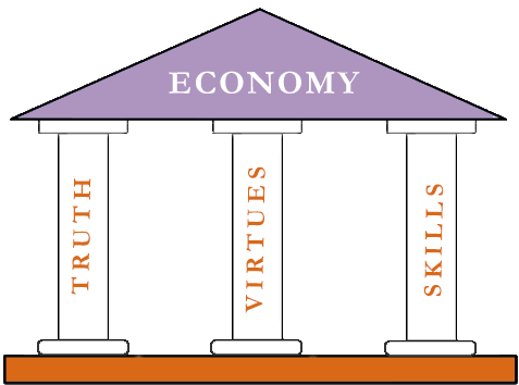 The model for overcoming crisis and for the lasting success and happiness, suggested by "The School of Life" (i.e. its founder Talidari), is that our economy, our society and the success of its individuals should be based on three pillars - knowledge, skills and virtues, with emphasis on the virtues: